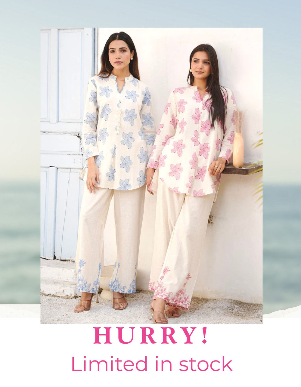 CREAM & BLUE FLOWER COTTON SLUB KURTA SET