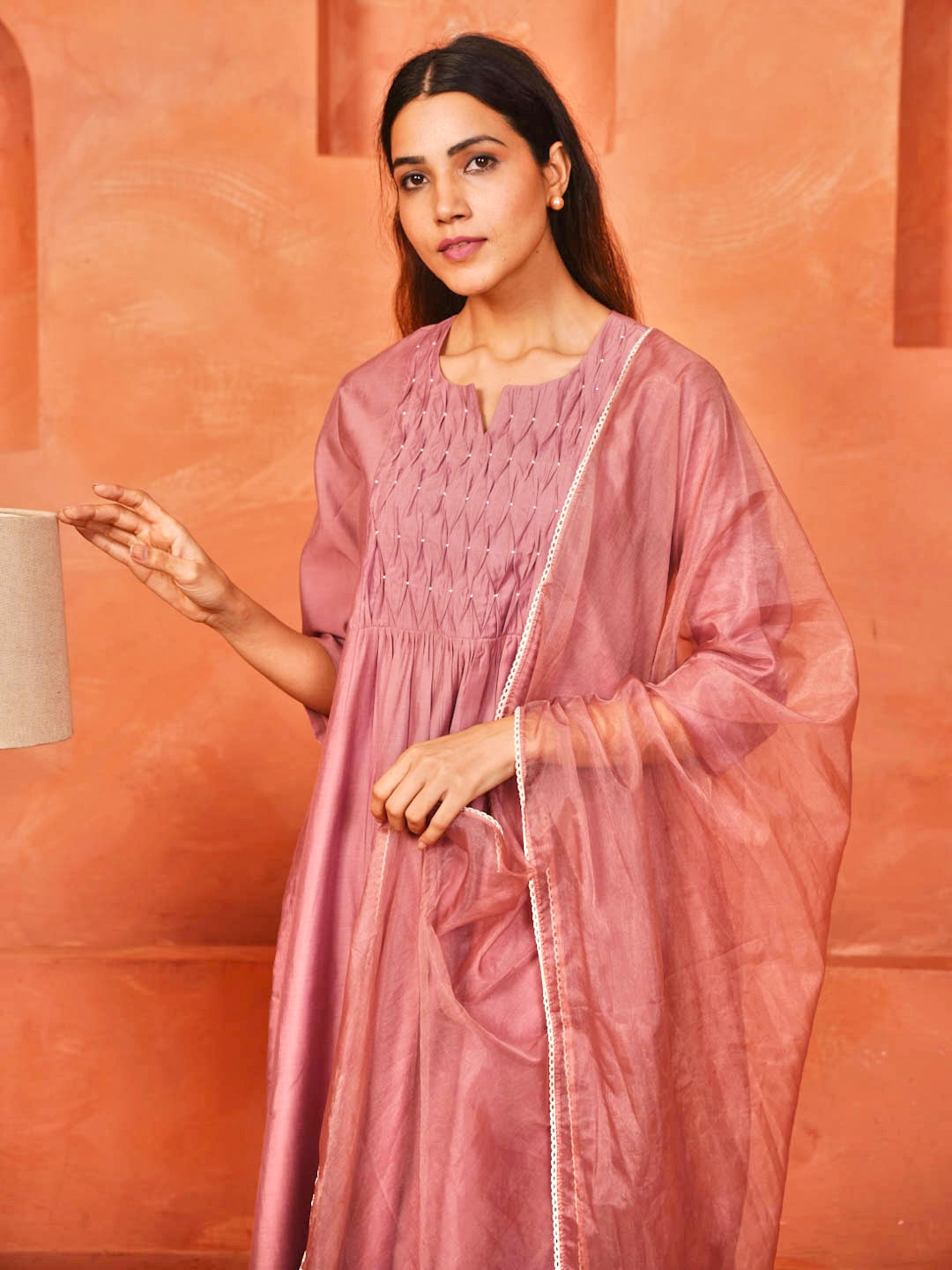 EARTHY PINK SMOCKING WORK SUIT SET WITH ORGANZA DUPATTA